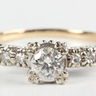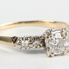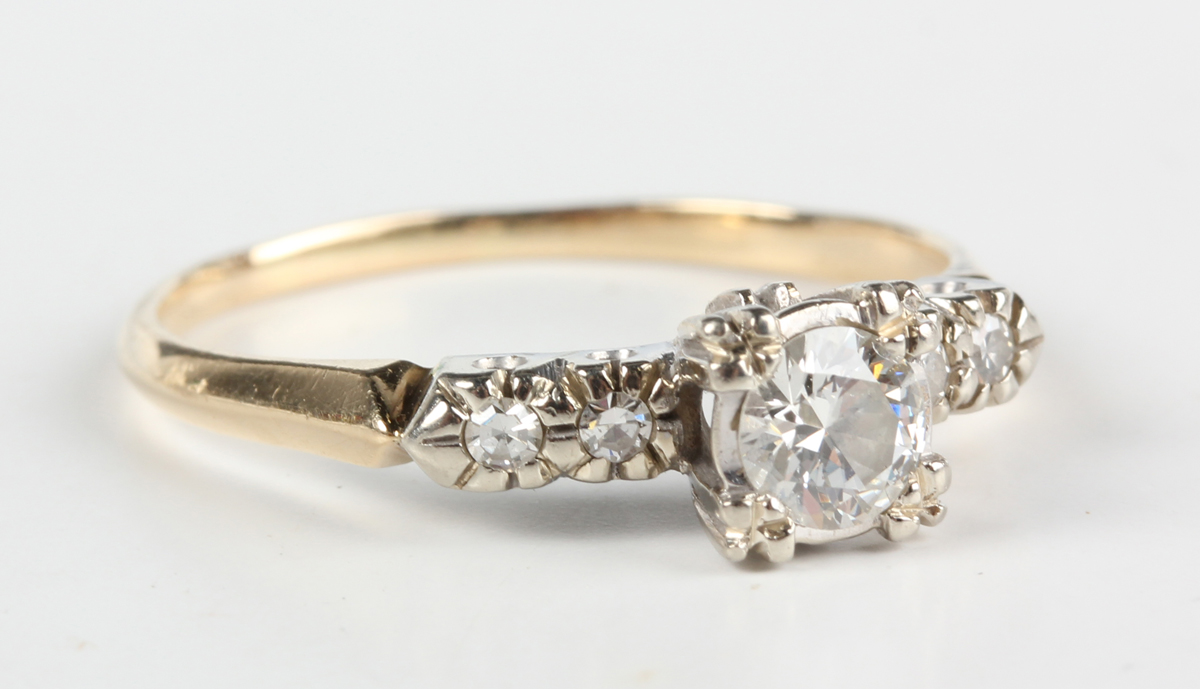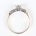 A gold and diamond ring, mounted with the principal circular cut diamond between diamond two stone shoulders, detailed ‘14K’, weight 2.3g, ring size approx R.