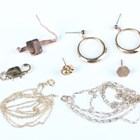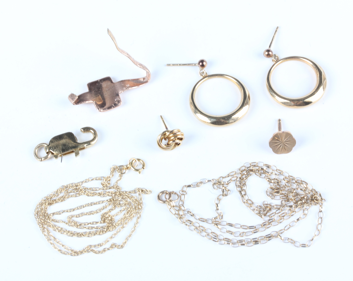 A group of mostly 9ct gold jewellery, comprising a pair of earrings, an odd earring, a tie stud, two neckchains, a clasp and a signet ring (badly damaged), total weight 7.8g.