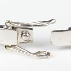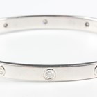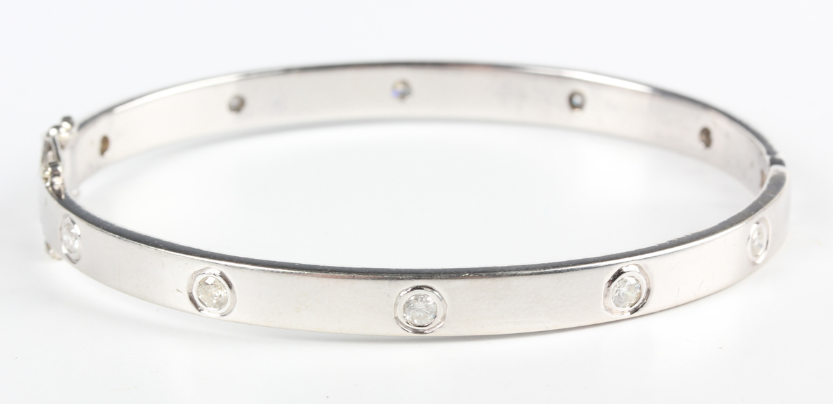 A white gold and diamond oval hinged bangle, collet set with ten circular cut diamonds, with fold-over safety catches, detailed ‘14K’, weight 25.6g, inside width 5.9cm, with a case.