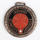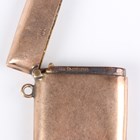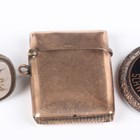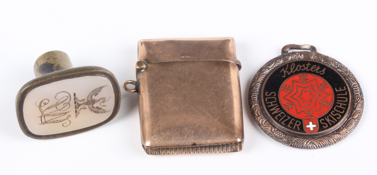 A 9ct gold rectangular vesta case, Chester 1903, weight 13.2g, length 4cm, a chalcedony seal, crest and monogram engraved (the handle lacking), and an enamelled fob, detailed ‘Klosters’.