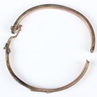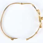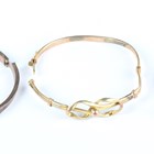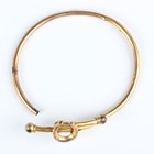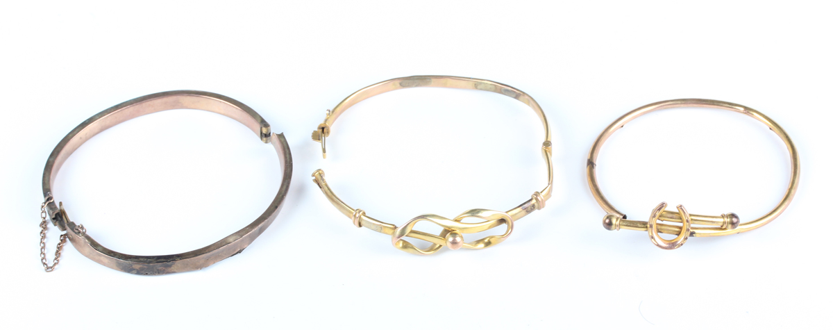 A 9ct gold hinged bangle in a bead and looped bow design, a gold bangle with a horseshoe motif, detailed ‘9ct', total weight 9g, and another bangle, unmarked.