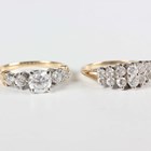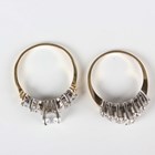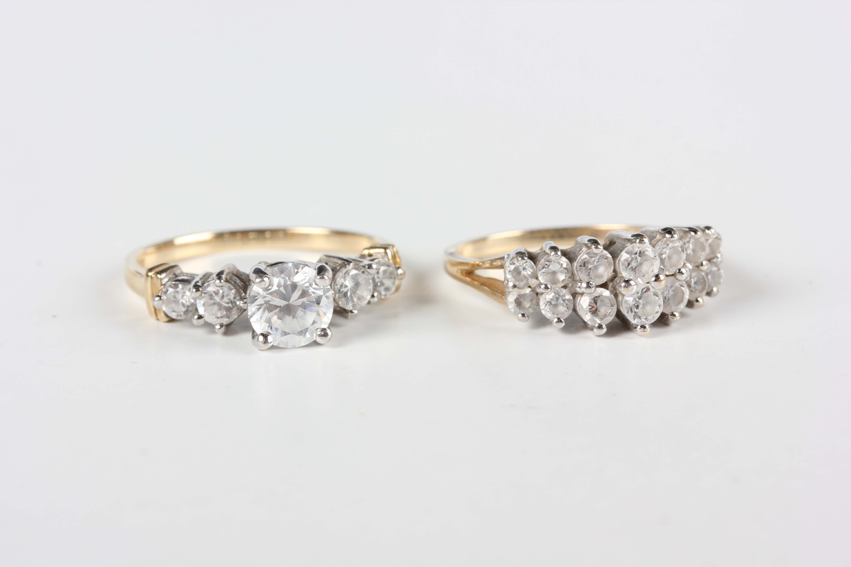 A 14ct gold and colourless gem set ring, the principal colourless gem mounted at the centre, ring size approx M, and another 14ct gold and colourless gem set ring in a two row design, ring size approx J, total weight 5.8g.