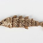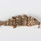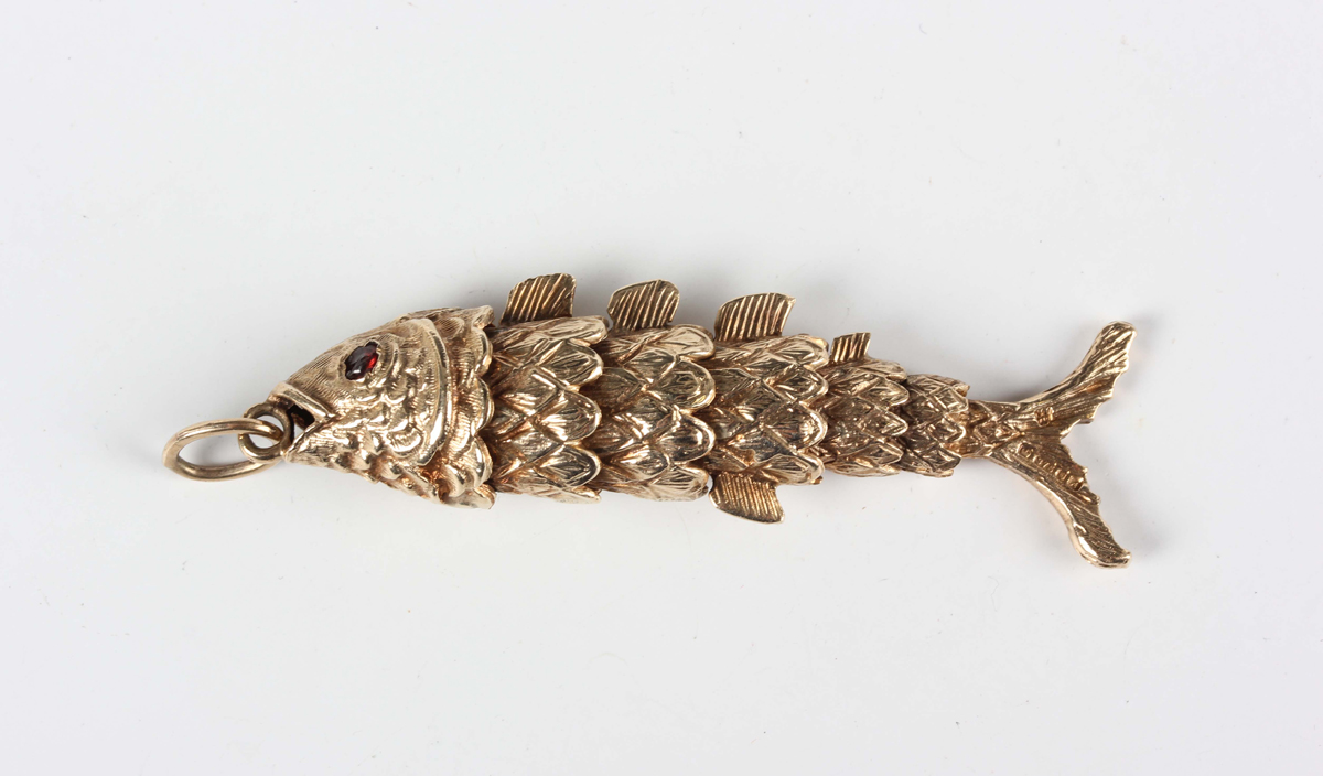 A 9ct gold pendant, designed as an articulated fish with garnet set eyes, weight 18.7g, length 6.5cm.