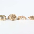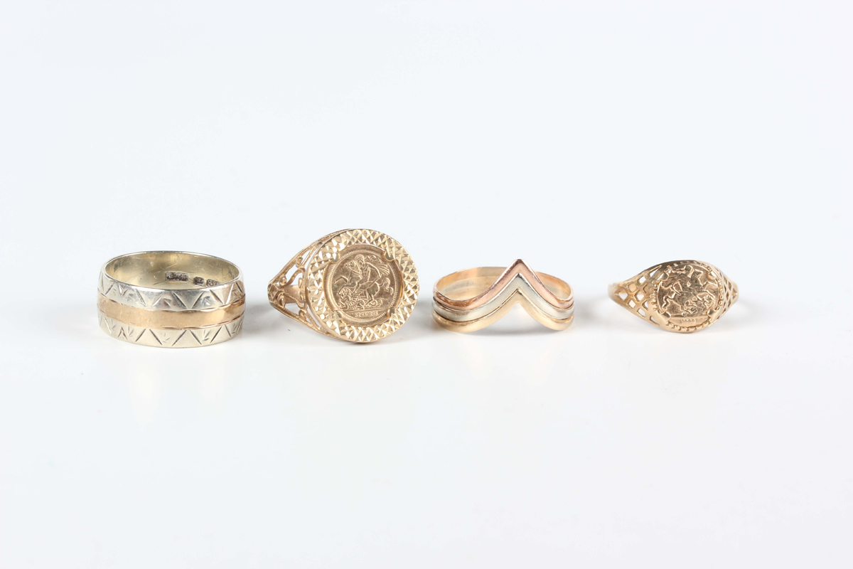 A 9ct two colour gold wedding band with engraved decoration, ring size approx K, and three further 9ct gold rings, total weight 8.2g.