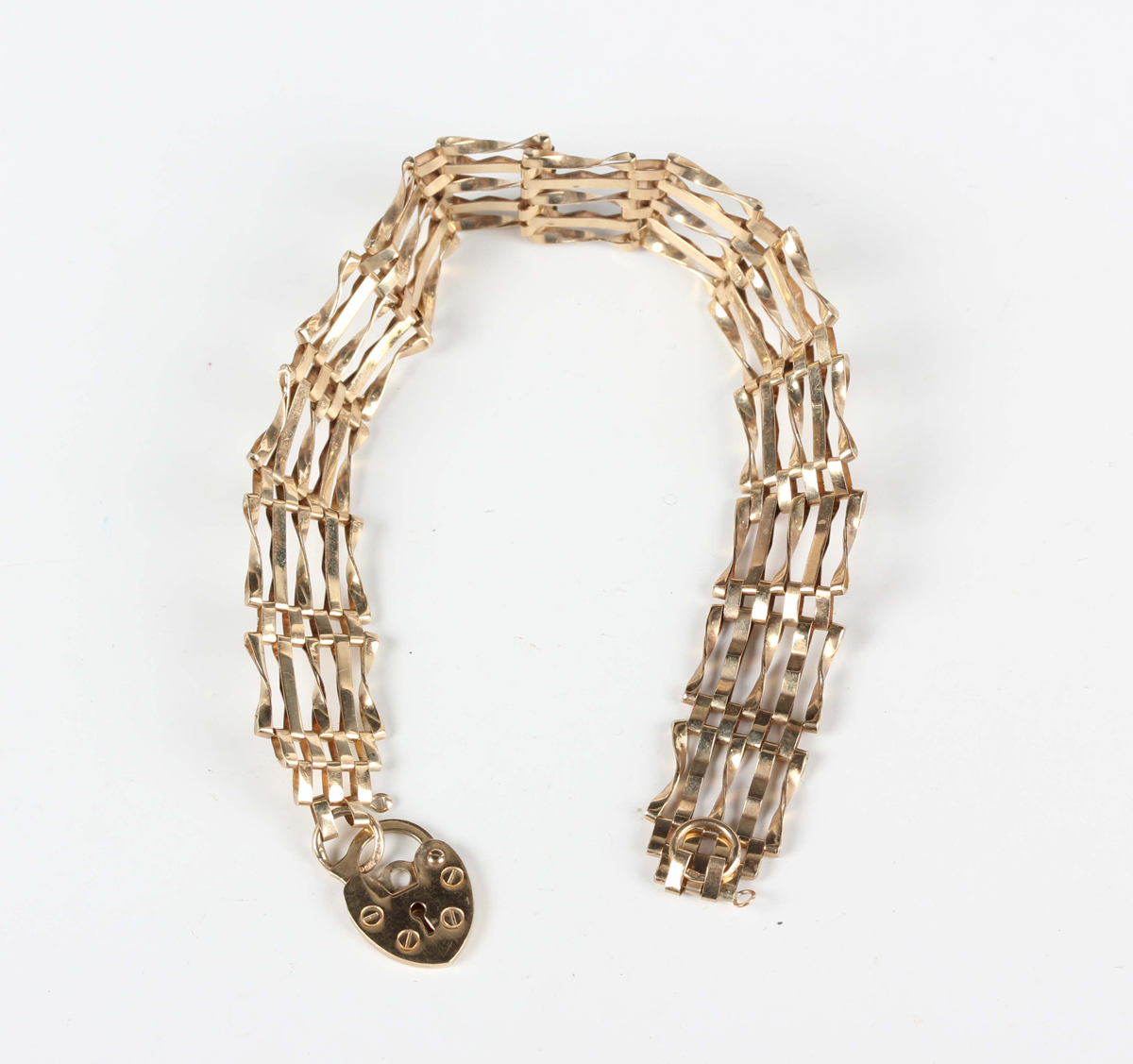 A 9ct gold gatelink bracelet on a 9ct gold heart shaped padlock clasp, total weight 5.3g, length 17cm.