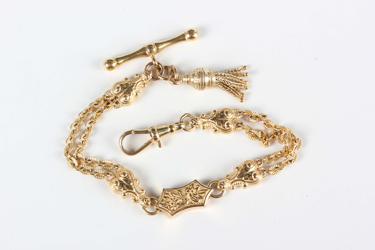 A gold bracelet in a dress Albertine design, fitted with a swivel, T-bar and tassel, weight 13.9g, length 18.5cm.
