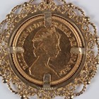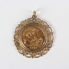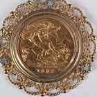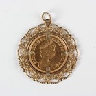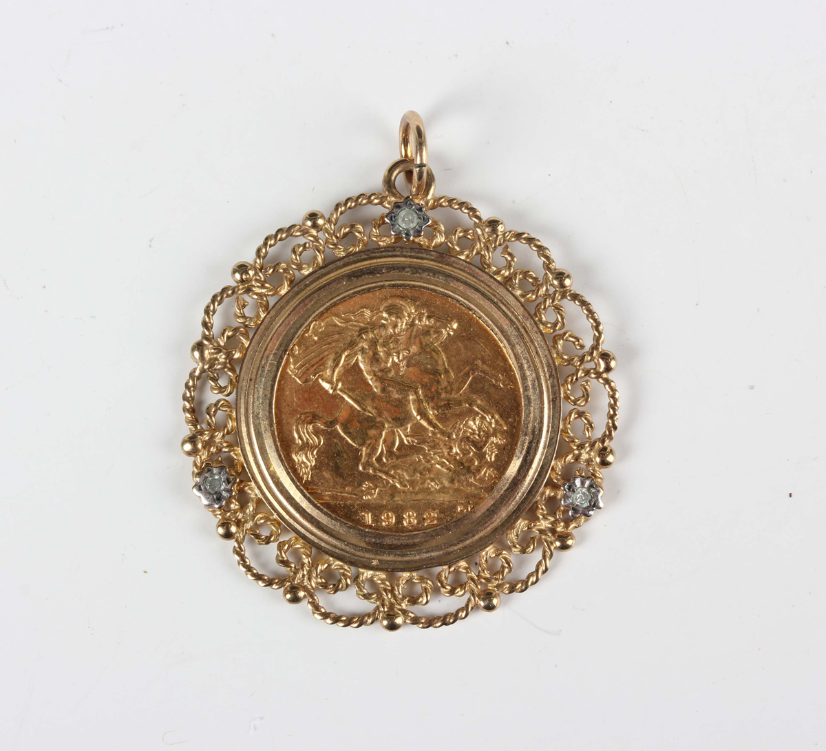 An Elizabeth II half-sovereign 1982 in a 9ct gold pendant mount with ropetwist and beaded scroll decoration, total weight 7.1g, length 3.2cm.