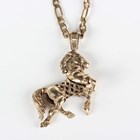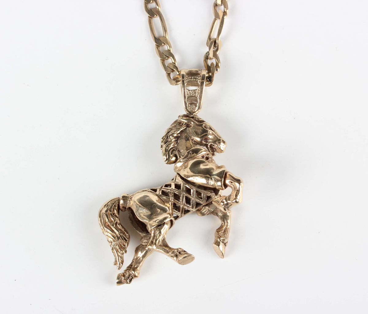 A 9ct gold pendant, designed as an articulated horse with pierced decoration, length 7cm, with a 9ct gold faceted curblink neckchain on a hook shaped clasp, length 55cm, total weight 51.9g.