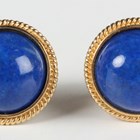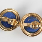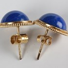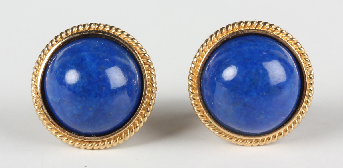 A pair of gold mounted lapis lazuli hemispherical earstuds with post fittings, detailed '14585', with one butterfly detailed '14K', and another butterfly detailed '750', total weight 3.1g, with a Liberty box.