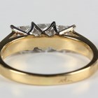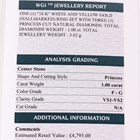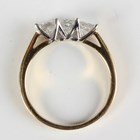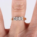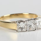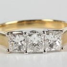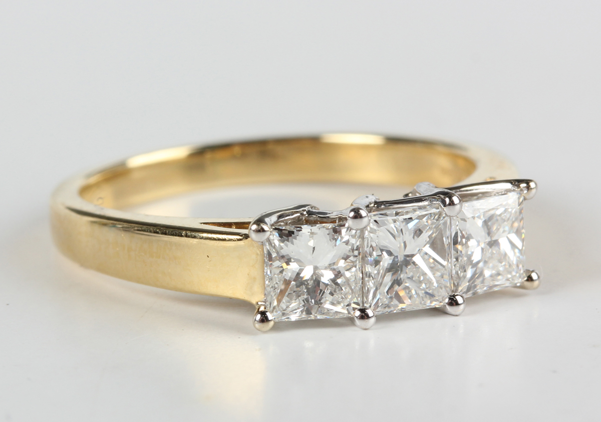 An 18ct yellow and white gold and diamond three stone ring, claw set with a row of princess cut diamonds, weight 3.5g, total diamond weight 1.00ct, ring size approx L, with a World Gemological Institute Report.