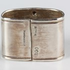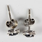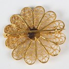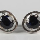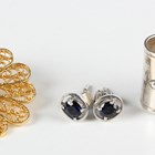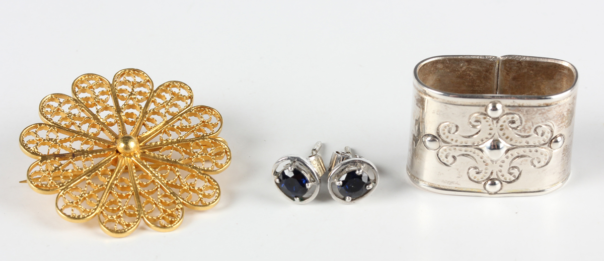 A pair of white gold and sapphire single stone earstuds with post and butterfly fittings, detailed '9K', total weight 1.3g, cased, a .800 silver scarf clip, the front with engraved decoration, weight 6.6g, and a gilt metal filigree brooch in the form of a daisy, width 2.7cm.