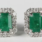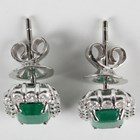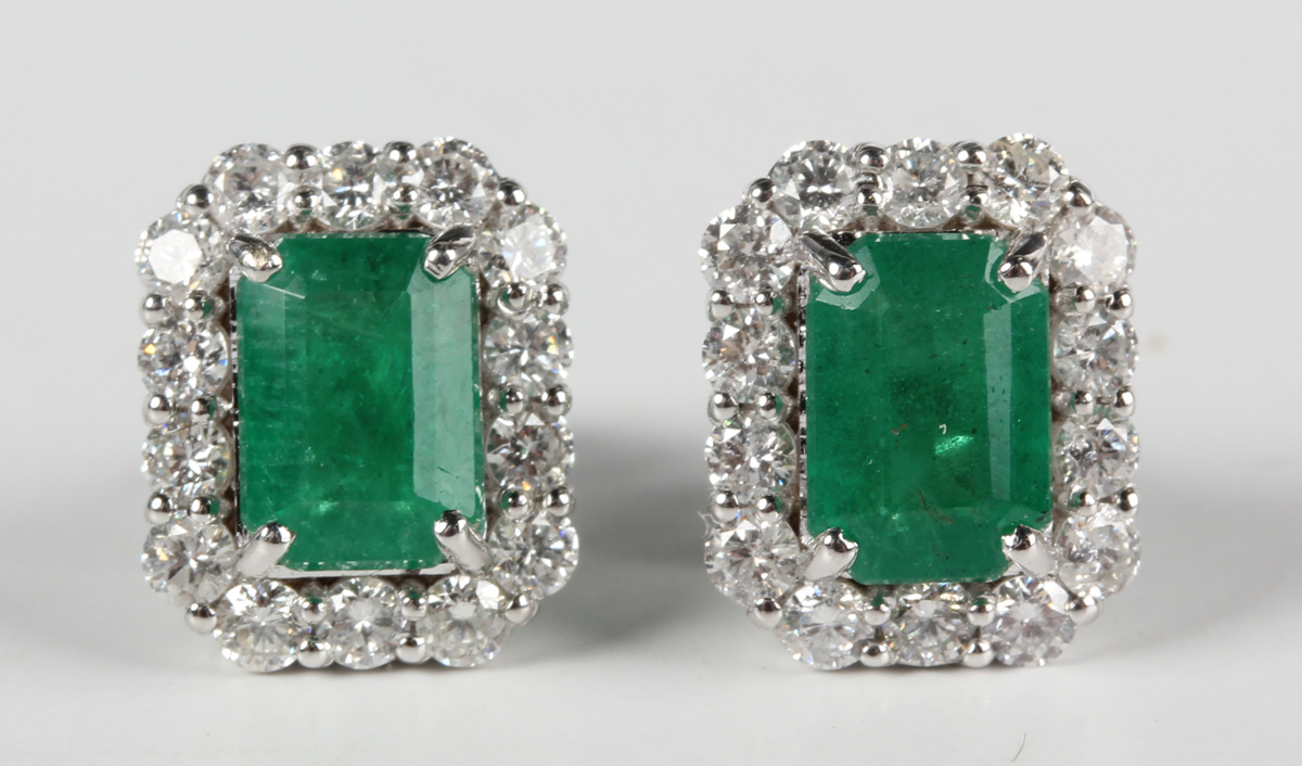 A pair of white gold, emerald and diamond cluster earrings, each claw set with a step cut emerald within a surround of round brilliant cut diamonds, with post and butterfly fittings, detailed '18K', total weight 4g, total emerald weight approx 1.43ct, total diamond weight approx 0.73ct, cased.