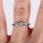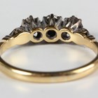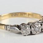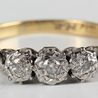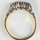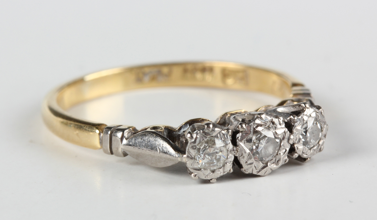 A gold, platinum and diamond three stone ring, mounted with circular cut diamonds, detailed '18ct' and 'Plat', weight 3.1g, ring size approx O.