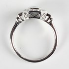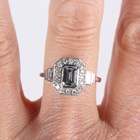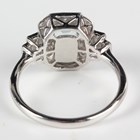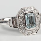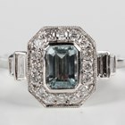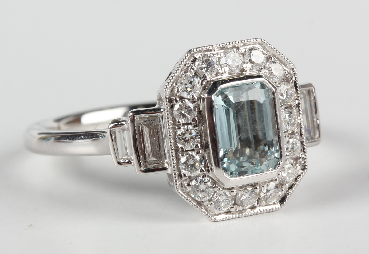 A platinum, aquamarine and diamond cluster ring, mounted with a step cut aquamarine within a canted corner surround of round brilliant cut diamonds, between baguette cut diamond two stone shoulders, weight 6.2g, aquamarine weight approx 0.75ct, total diamond weight approx 0.57ct, ring size approx P.
