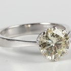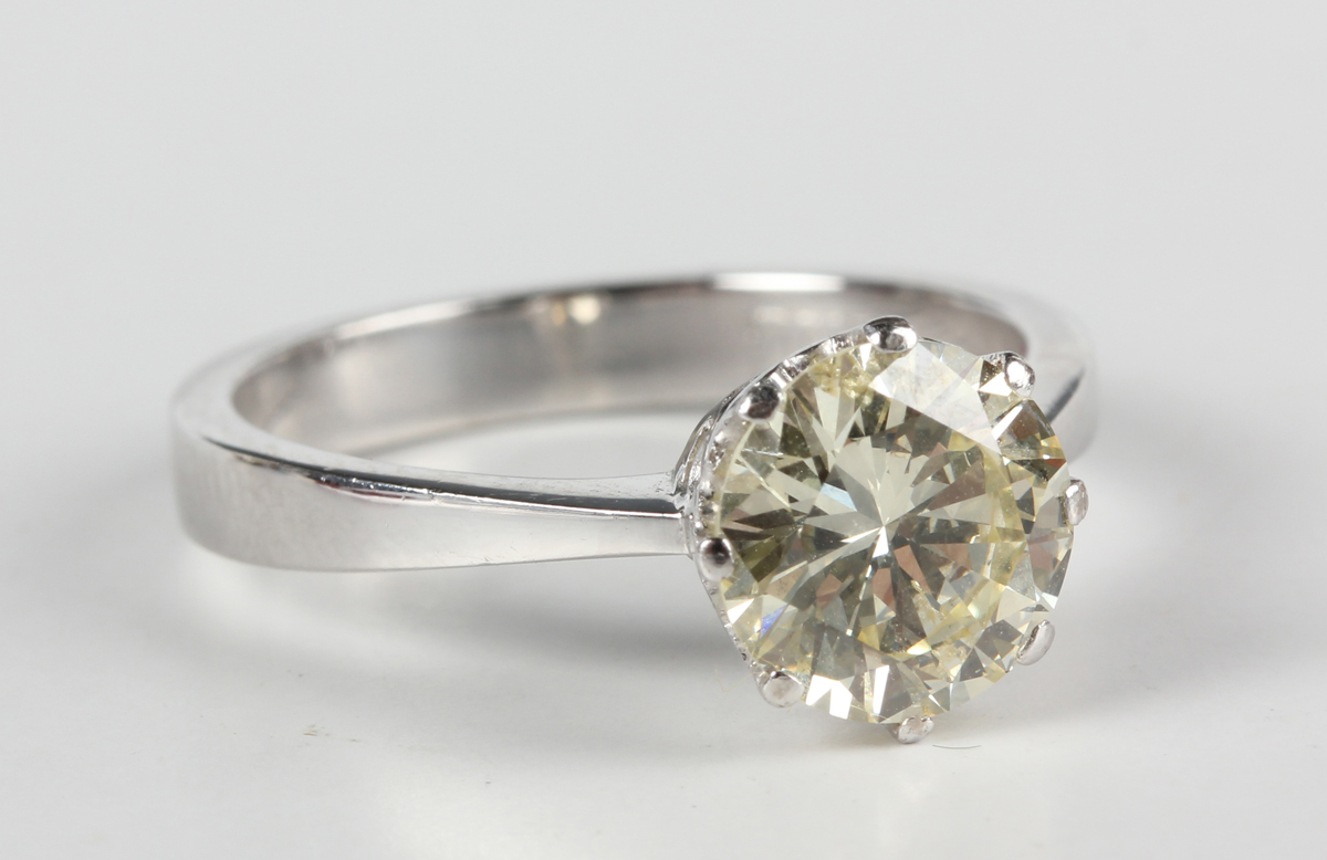 A white gold and diamond single stone ring, claw set with a circular cut diamond, detailed ‘750’, weight 4.4g, diamond weight approx 1.75-1.85ct, colour grade approx P-R, clarity grade approx SI2, ring size approx M1/2, with a case.