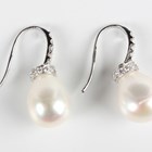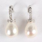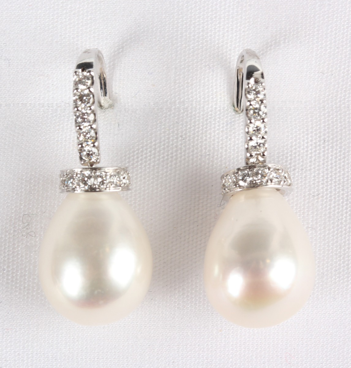 A pair of 18ct white gold, cultured pearl and diamond pendant earrings, each cultured pearl surmounted by a diamond set collar and diamond set hook shaped fittings, total weight 5g, total diamond weight approx 0.40ct, length 2.2cm, with a case.