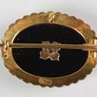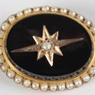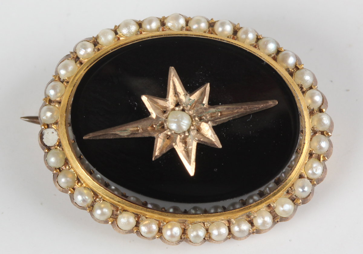A gold, black onyx and seed pearl oval brooch, mounted with a single seed pearl within a star shaped setting and an outer border of seed pearls, detailed ‘9ct’, weight 3.6g, width 2.5cm.