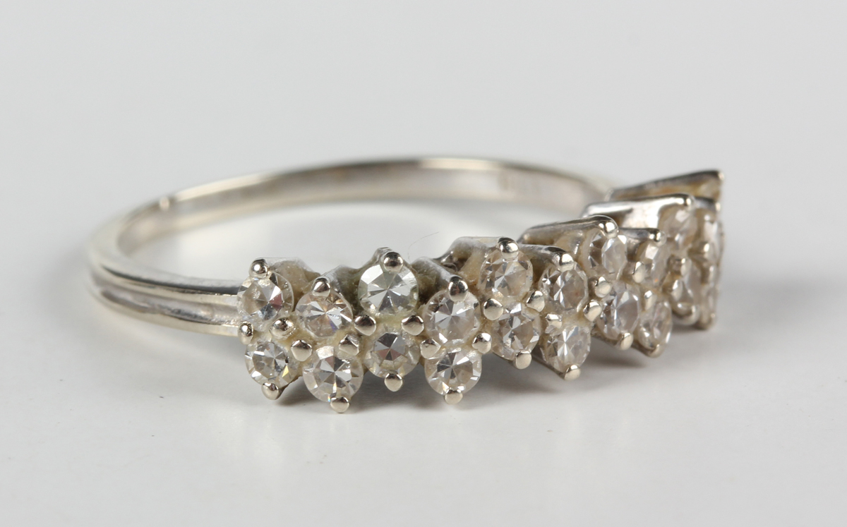 A white gold and diamond ring, mounted with single cut diamonds, detailed ‘18c’, weight 2.6g, ring size approx L1/2.