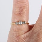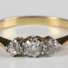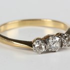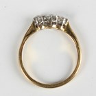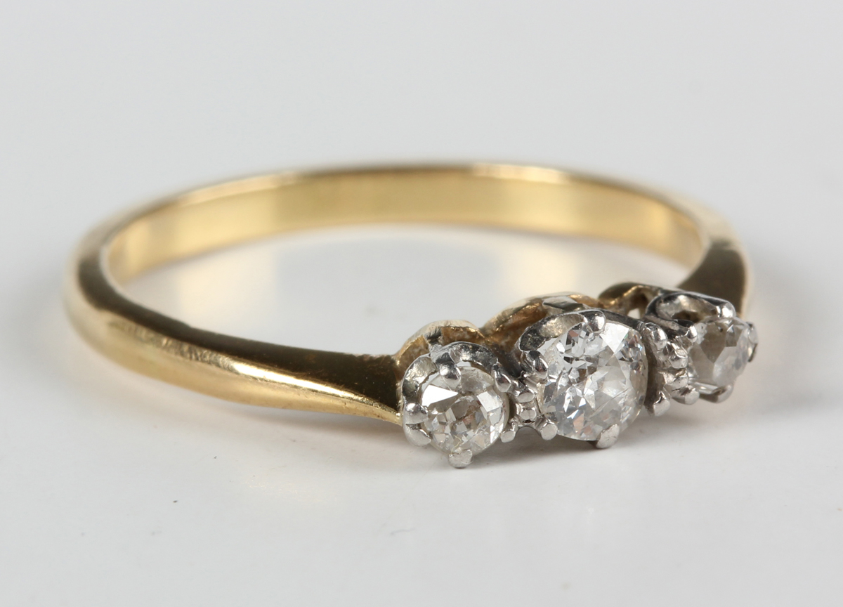A gold and diamond three stone ring, claw set with a row of cushion shaped diamonds with the principal diamond mounted at the centre, unmarked, weight 2.2g, ring size approx L.