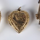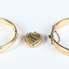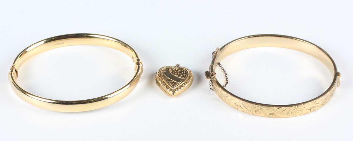 A gold oval hinged bangle, detailed ‘375’, inside width 6cm, a gold back and front heart shaped pendant locket, length 2.2cm, total weight 11.8g, and a gilt metal oval hinged bangle with engraved decoration.