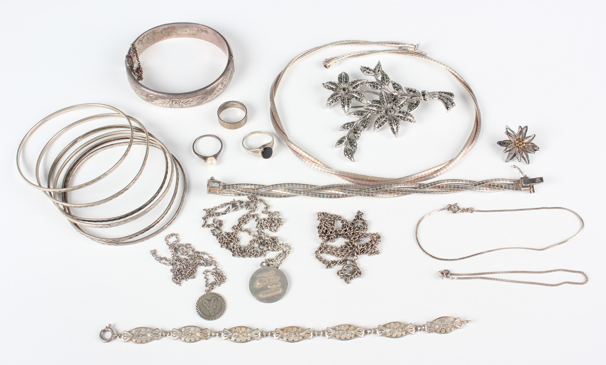 A group of mostly silver jewellery, comprising six matching bangles, an oval hinged bangle, a collar necklace with a matching bracelet, three rings, three bracelets, two pendants with neckchains, another neckchain, a marcasite brooch and a filigree brooch.