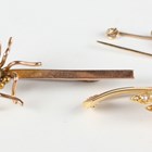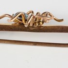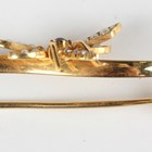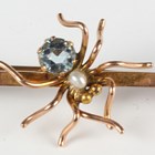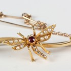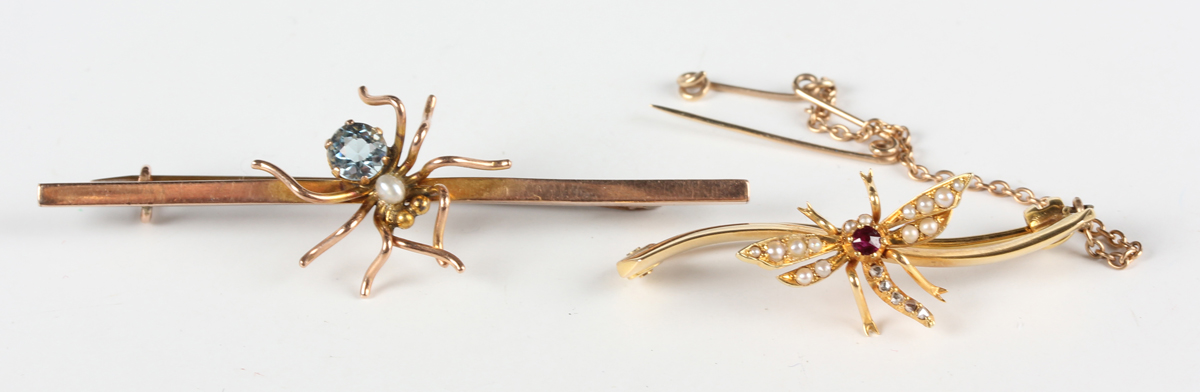A gold, ruby, diamond and seed pearl bar brooch in a scroll design, centred by a winged insect, detailed '15ct', weight 3.2g, width 3.7cm, and a gold, freshwater pearl and pale blue gem set bar brooch, centred by a spider, detailed '9ct', weight 2.3g, width 5.5cm.