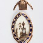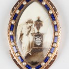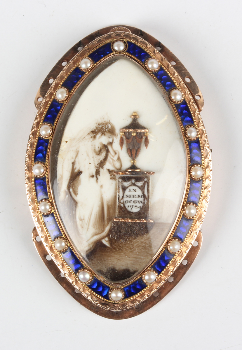 A George III gold, blue enamelled and half-pearl set navette shaped mourning clasp, the front glazed with the figure of a woman seated beside an urn, the pedestal detailed 'In Mem Of GW 1784', within a blue enamelled and half-pearl surround, weight 16.3g, length 4.6cm, width 3cm.