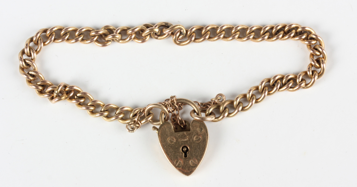 A 9ct gold solid curblink bracelet on a 9ct gold heart shaped padlock clasp, London 1963, weight 12g, length 17.5cm.