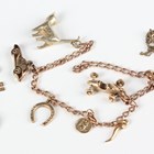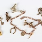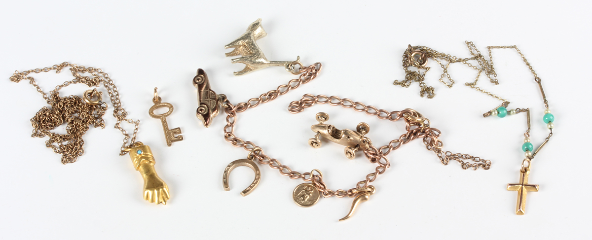 A gold curblink bracelet, fitted with six gold charms, including a cat, racing car and a horseshoe, a 9ct gold key charm, total weight 14g, an imitation pearl and green bead gilt metal necklace with a 9ct gold pendant cross charm, and a pendant, designed as a fist, with a gilt metal neckchain.