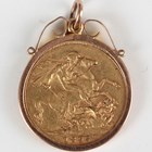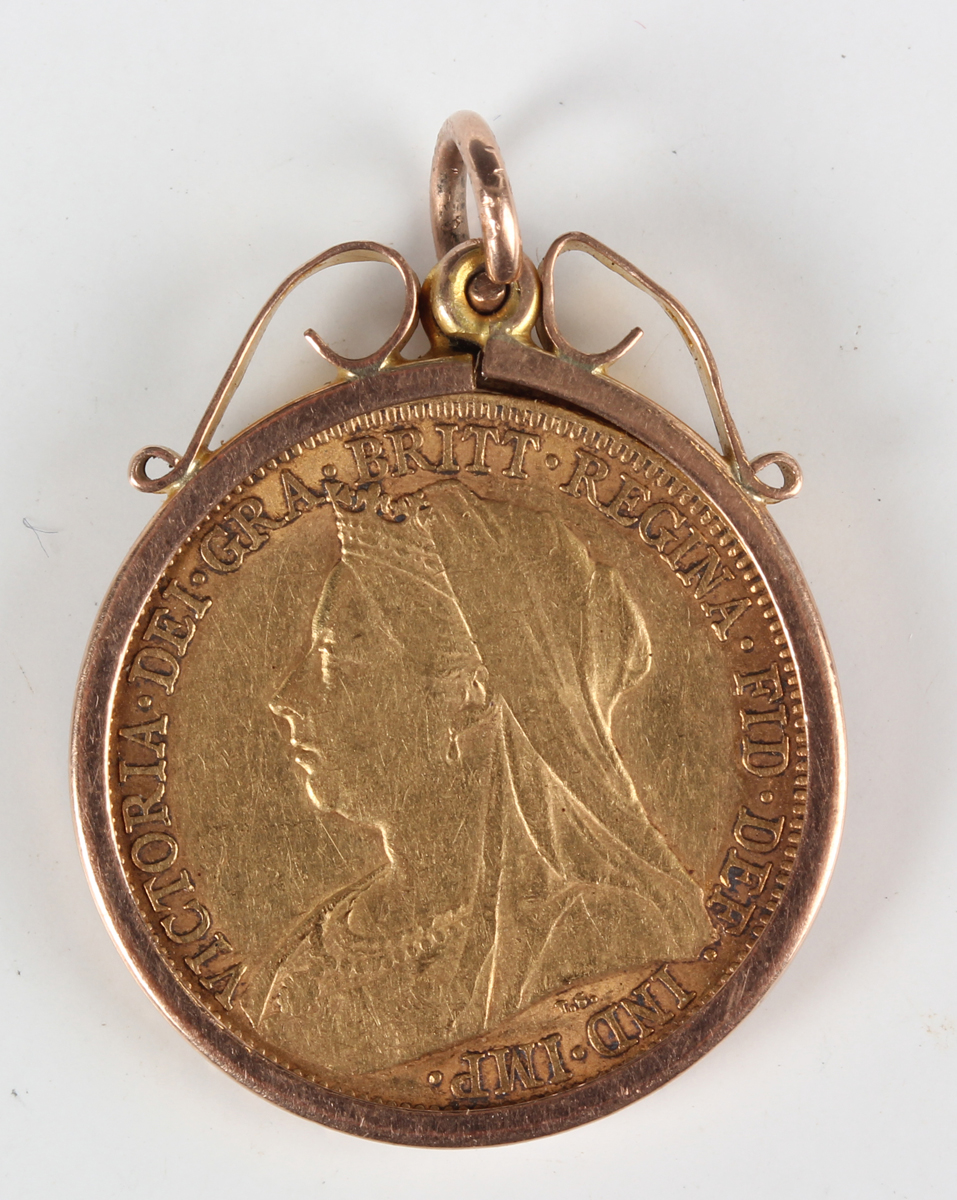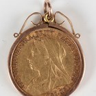 A Victoria Old Head sovereign 1895 in a gold pendant mount, detailed ‘9c’, total weight 9.5g.