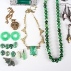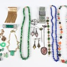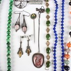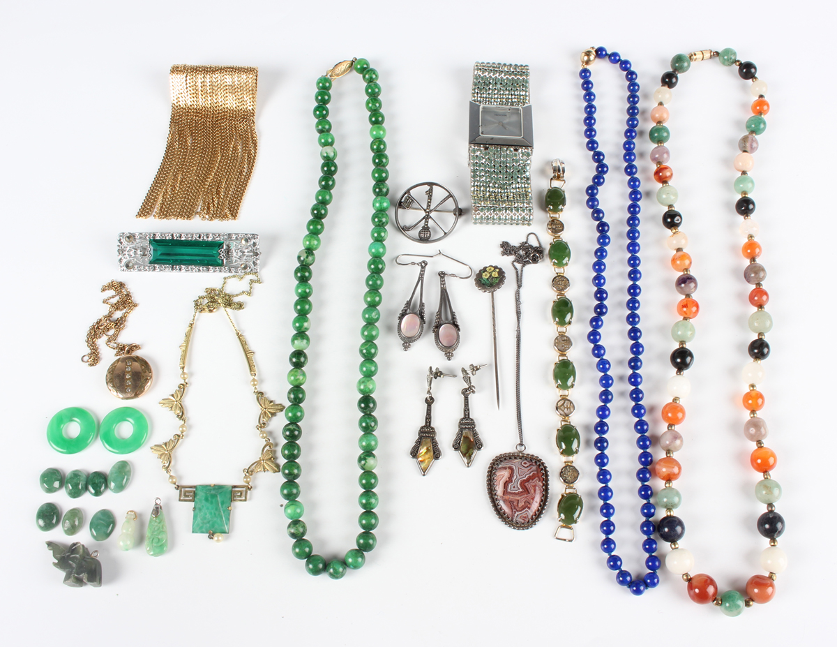 A lapis lazuli bead necklace, length 58cm, a varicoloured agate bead necklace, a gilt metal mounted nephrite jade bracelet, a small group of jade pendants, bi's and cabochons, a silver and enamelled stickpin, Birmingham 1885, two pairs of earrings, a silver and agate pendant and a small group of costume jewellery.