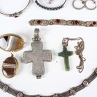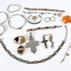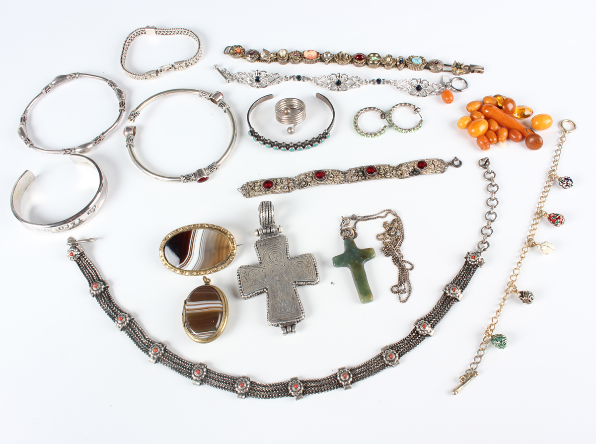 A small group of assorted jewellery, including various amber beads and drops, a gilt metal and banded agate oval pendant locket, a similar brooch, a Byzantine style reliquary cross pendant, detailed '950', length 8.5cm, and various bangles, bracelets and pendants.