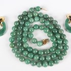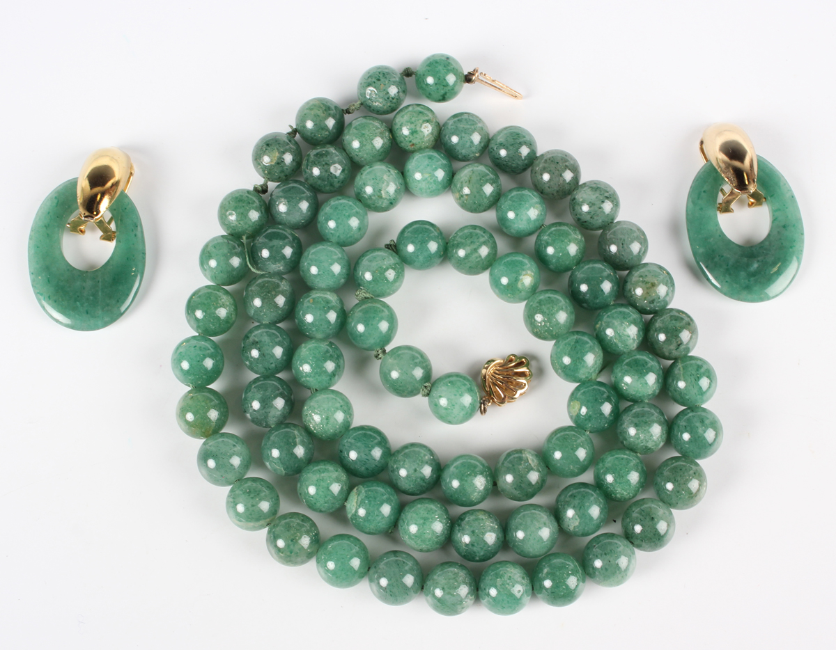A single row necklace of aventurine beads on a gold clasp, length 86cm, and a pair of similar oval earclips with gilt metal fittings.