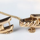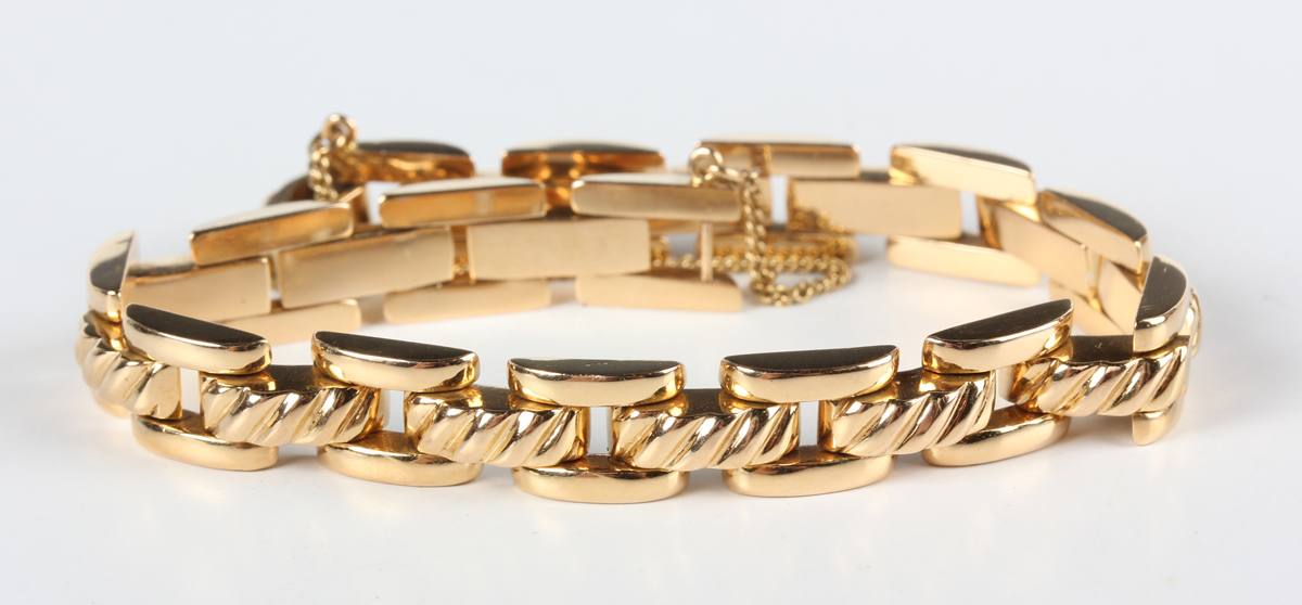 A gold bracelet, the central links with slanting fluted decoration between plain curved side links, on a foldover clasp, detailed ‘0750’, weight 19.5g, length 18.5cm.