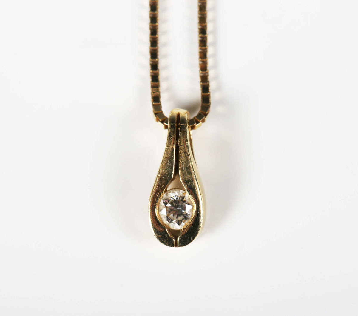 A gold necklace with circular brilliant cut diamond set pendant, the gold fine link chain detailed '750', the boltring clasp detailed '375', the pendant mount detailed '750', total weight 3.6g, total length 47cm, accompanied by an Amstel Diamonds Ltd diamond certificate.