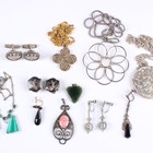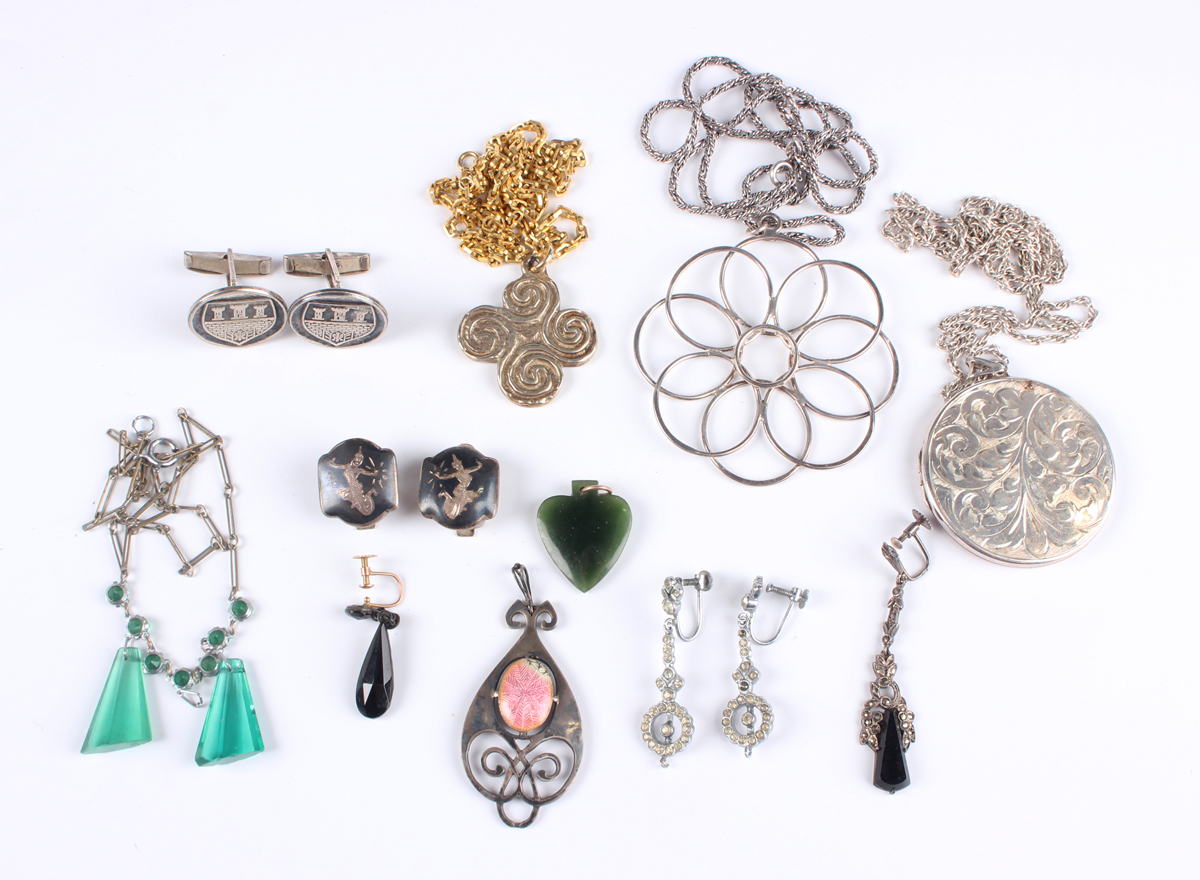 A silver and pink enamelled pendant of Arts and Crafts design, length 5.5cm, a nephrite pendant, a pair of colourless paste pendant earrings, two odd earrings, a pair of niello earclips, a pair of silver cufflinks, a silver circular pendant locket with a silver neckchain, a sterling silver pendant with a gilt metal neckchain, another pendant with a silver neckchain, and a green paste necklace.