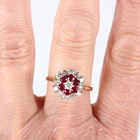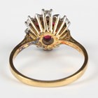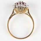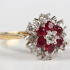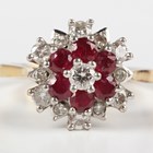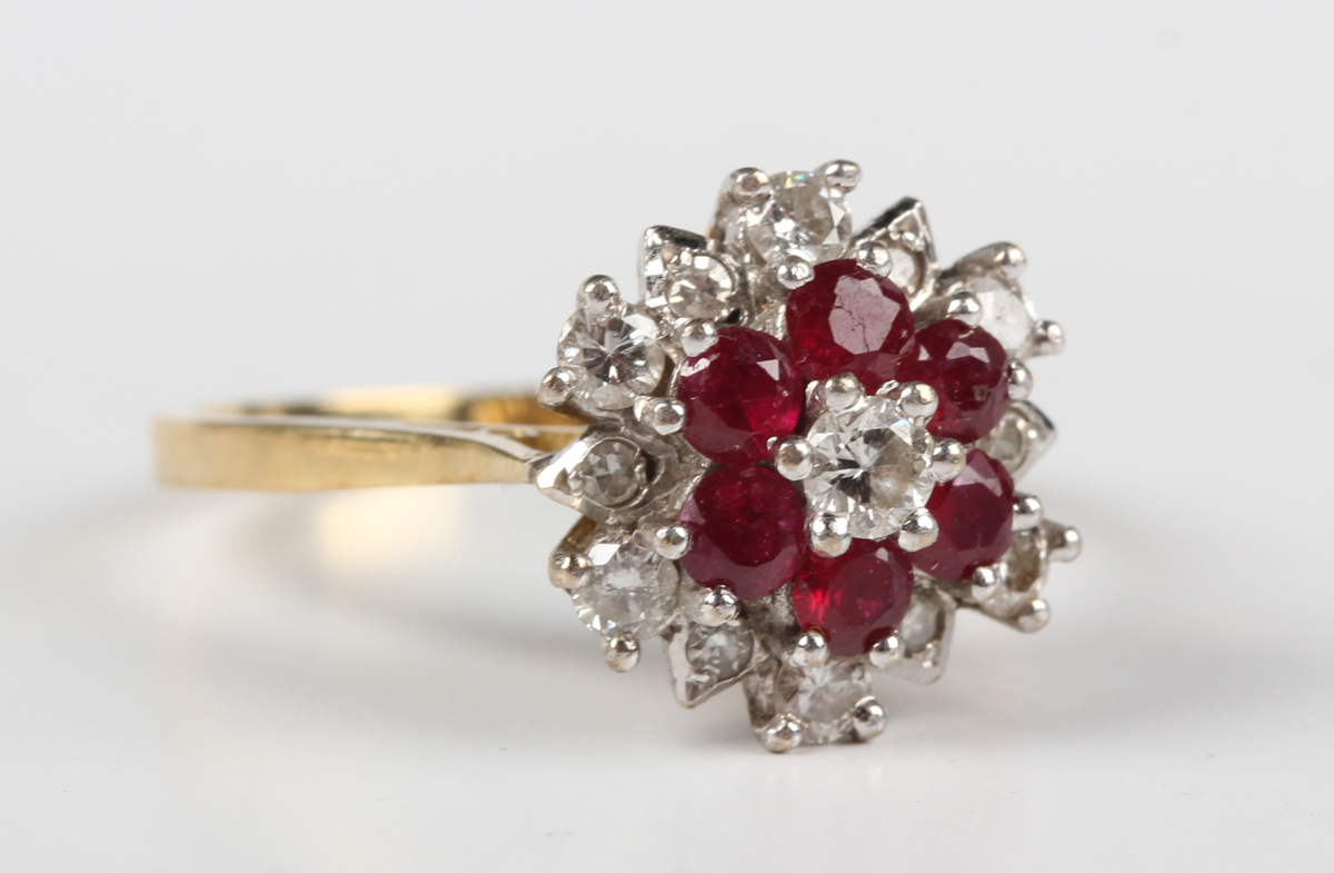 A gold, diamond and ruby cluster ring, claw set with the principal circular cut diamond within a surround of six circular cut rubies and a diamond set border, detailed ‘18ct’, weight 4.6g, ring size approx Q1/2.