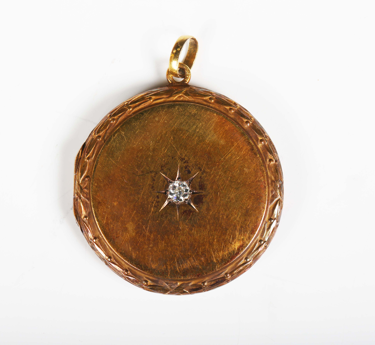 A gold and diamond single stone set circular pendant locket, the front star set with a circular cut diamond to the centre within an acanthus wreath surround, the interior with glazed locket compartments, unmarked, weight 7.1g, diameter 2.7cm.