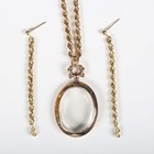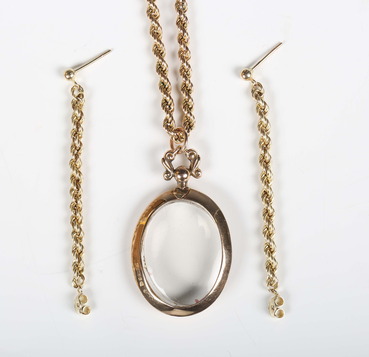A 9ct gold mounted oval pendant locket, glazed to back and front, Chester 1907, with a 9ct gold ropetwist link neckchain on a boltring clasp, and a pair of gold ropetwist link earrings, the butterflies detailed '9KT', total weight 16.6g.