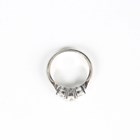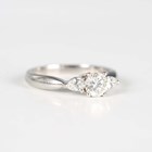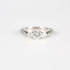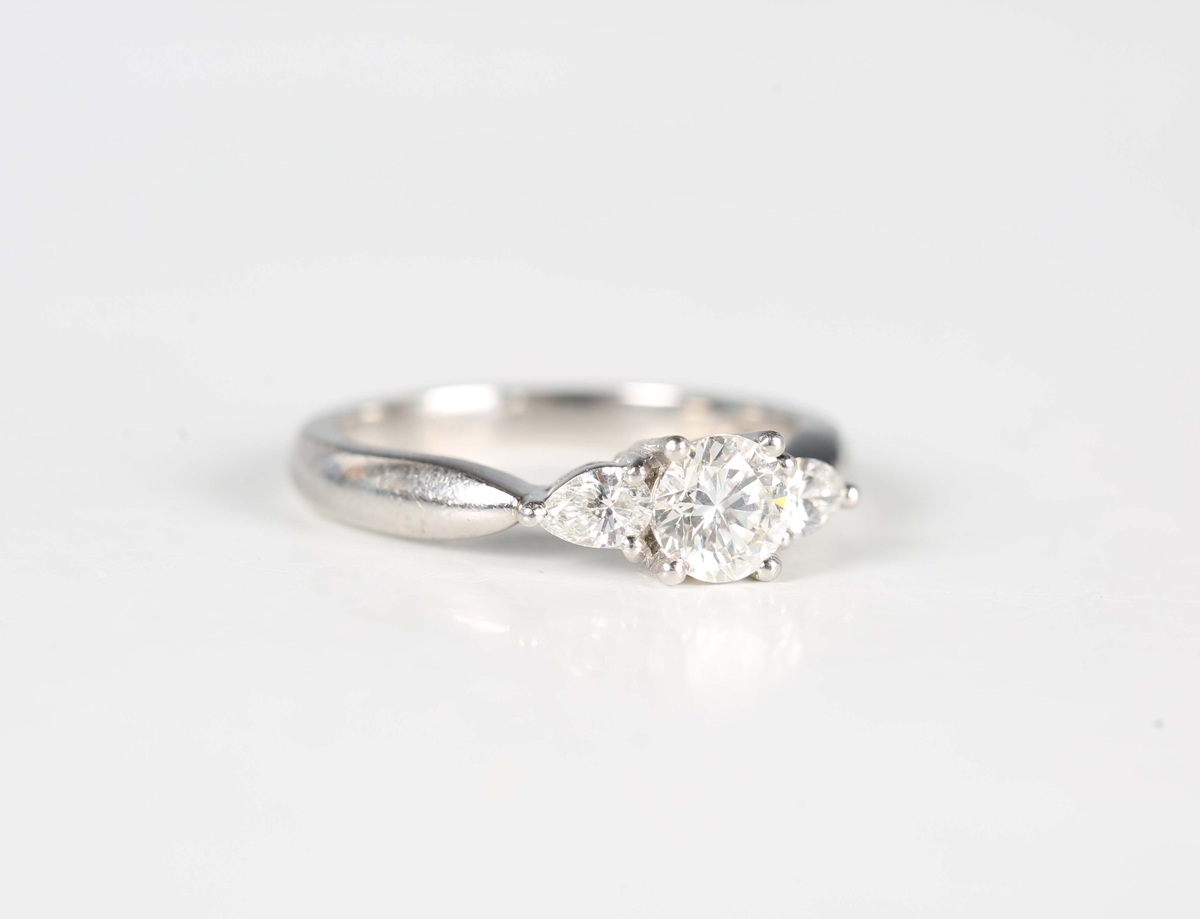 A platinum and diamond ring, claw set with the principal circular cut diamond between two pear shaped diamond shoulders, London 2011, weight 5.8g, principal diamond weight approx 0.61ct, total diamond weight approx 0.89ct, colour grade approx G, clarity grade approx VS2, ring size approx L.