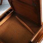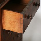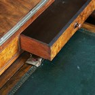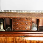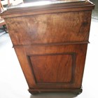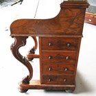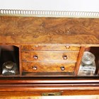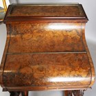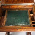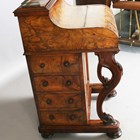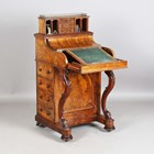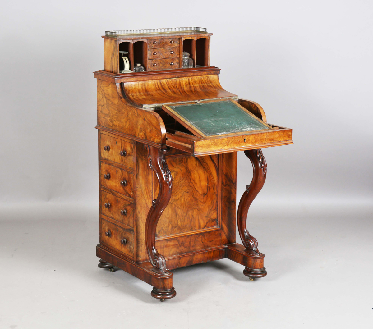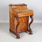 A mid-Victorian burr walnut pop-up piano top Davenport, the hinged top revealing a pull-out writing surface above carved supports and four side drawers, height 97cm, width 57cm, depth 57cm.