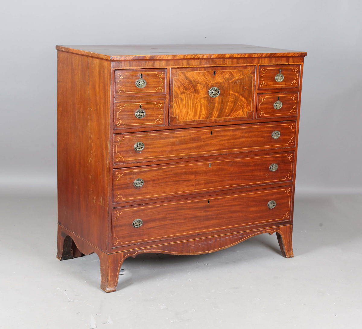 A George IV mahogany secrétaire chest with boxwood line inlay and crossbanding, fitted with a series of oak-lined drawers, height 119cm, width 122cm, depth 60cm.