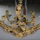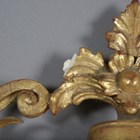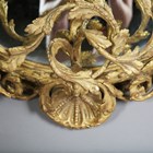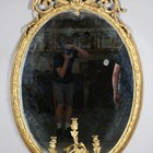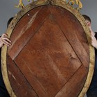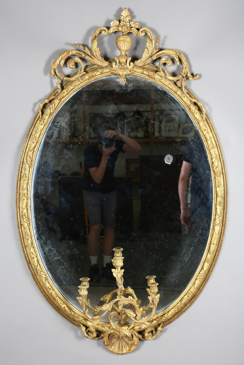 A large mid-Victorian gilt gesso oval girandole wall mirror, the urn and foliate scroll surmount above a berried laurel leaf frame and scallop shell terminal issuing three candle holders, height 166cm, width 103cm (some minor faults and repairs).