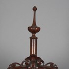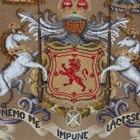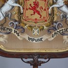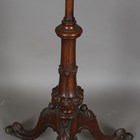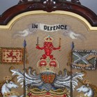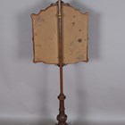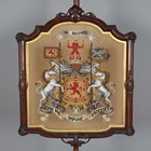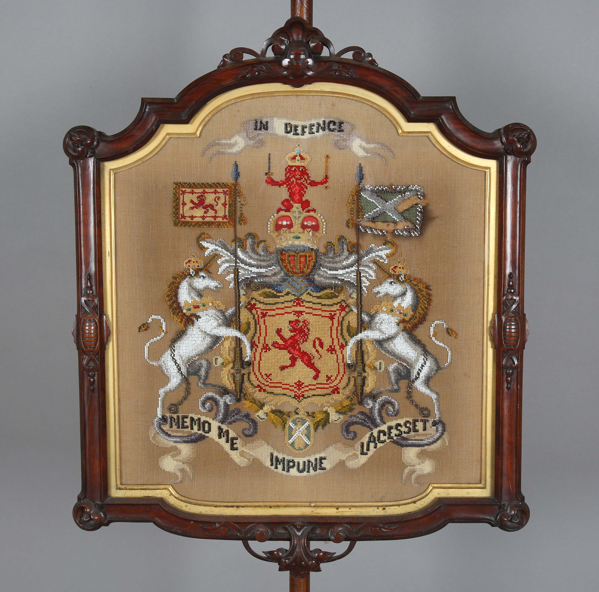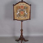 A mid-Victorian walnut polescreen, the glazed panel inset with a needlework and beadwork heraldic crest, raised on a carved tripod base, height 174cm, width 58cm.