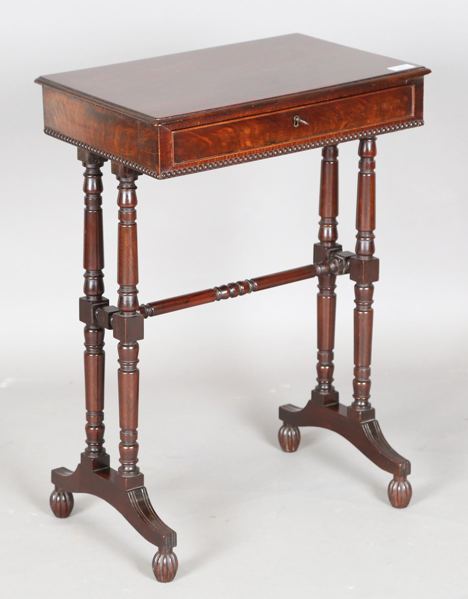 A small William IV mahogany side table, fitted with a single drawer and raised on turned supports, height 71cm, width 49.5cm, depth 34cm.