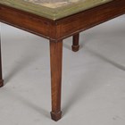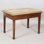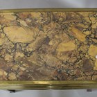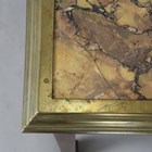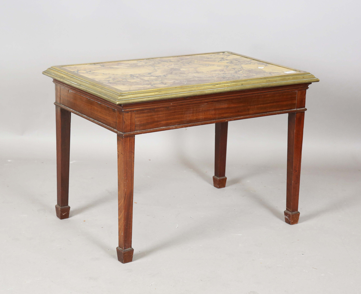 An early 20th century mahogany lamp table with a Siena marble top, mounted with a brass edge, height 55cm, length 79cm, depth 53.5cm.