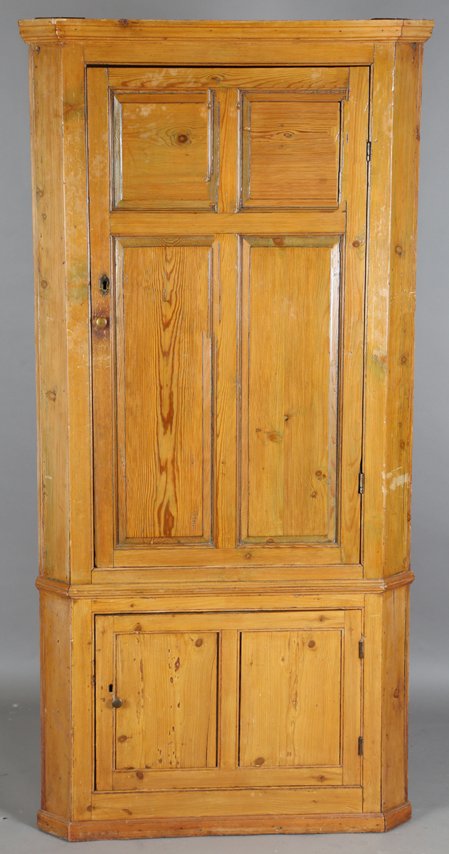 A George III provincial pine floor standing corner cupboard, height 190cm, width 93cm.