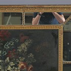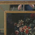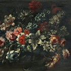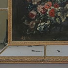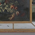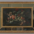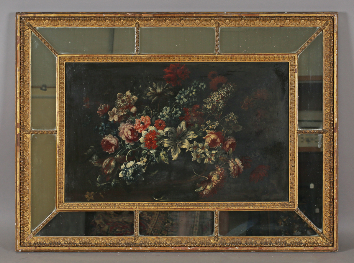 An early 20th century gilt composition sectional mirrored frame, inset with an 18th century oil on canvas floral still life of parrot tulips, delphiniums and roses, circle of Andrea Scacciati (Italian 1725-1771), 96cm x 129cm.