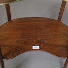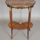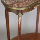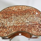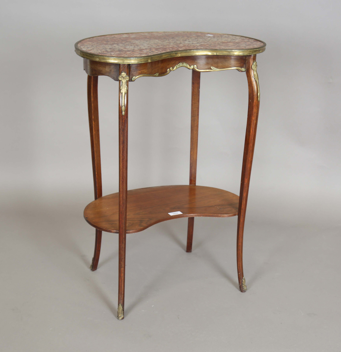 An early 20th century French walnut and gilt metal mounted kidney shaped side table with rouge marble top, height 73cm, width 55cm (crack to top).