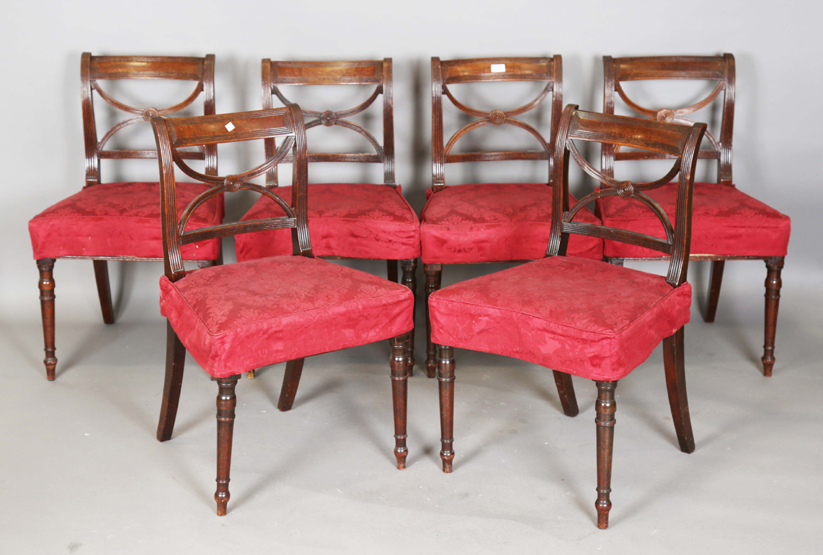 A set of six Regency mahogany bar back dining chairs with 'X' frame centre rails, height 85cm, width 50cm.